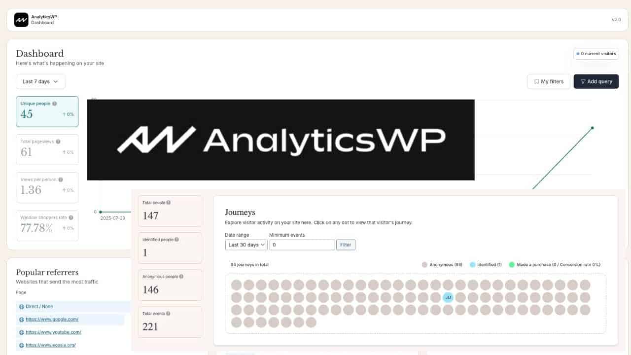 - You can track user journeys, even down to specific users. If you run this on a membership site, for instance, you would be able to see specific user interactions with your website and AnalyticsWP will know who they are because it can see your entire user database.