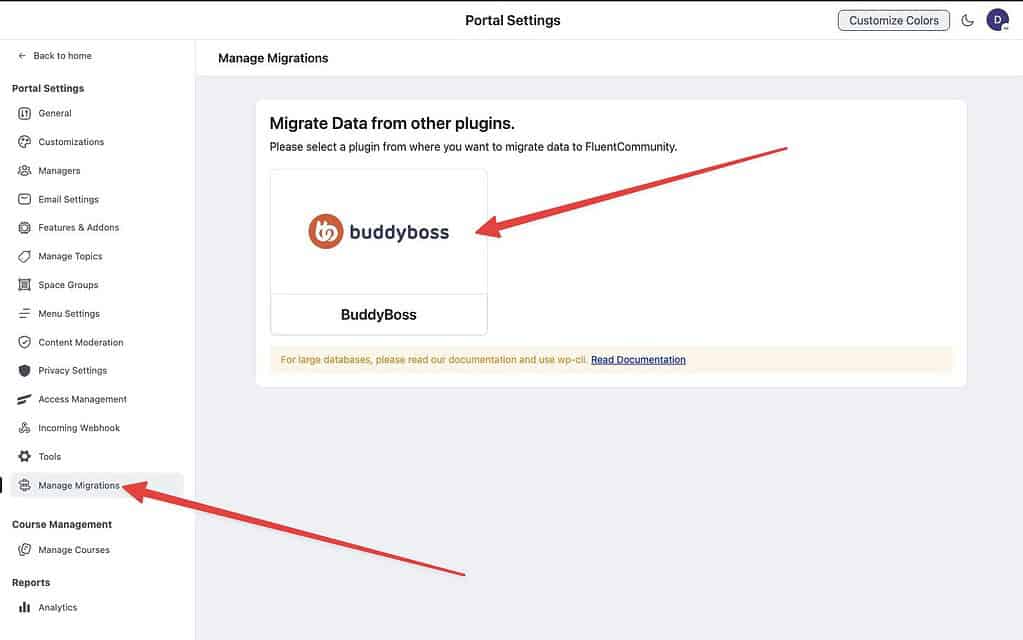 With all that done, go into FluentCommunity and into the Settings area for the plugin. You will see a menu option called “Manage Migrations”. Click that and you’ll see BuddyBoss right there as your migrator option.