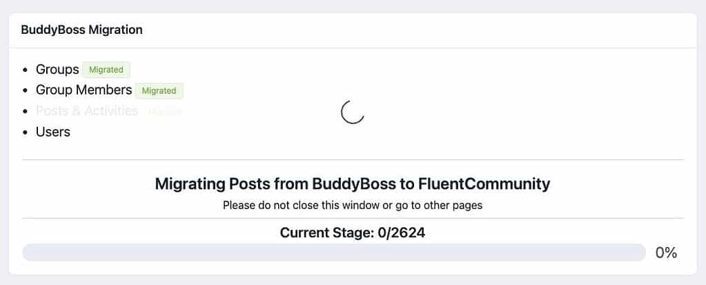 So, this is the easy part. 😇 FluentCommunity has a built-in migration process that will migrate your data from BuddyBoss into FluentCommunity. What it will include is: