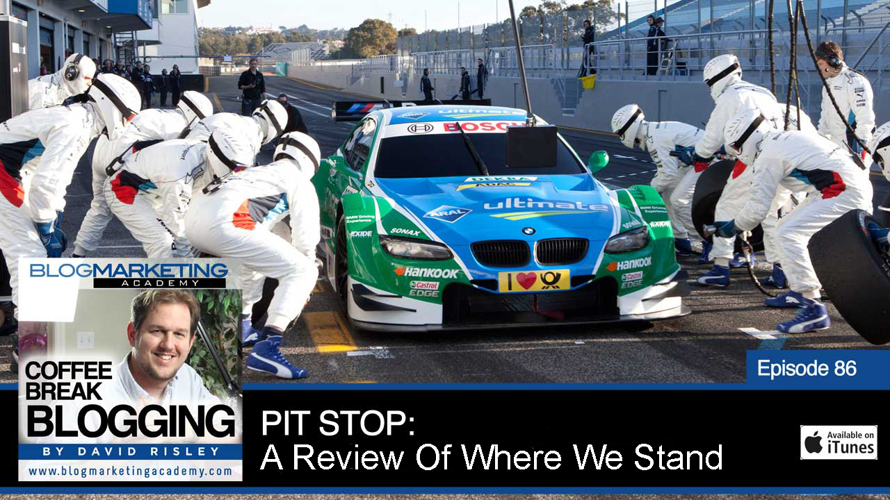 Now, the pit stop episode are ones that we do periodically because this is a 7-Stage Process that we are going through with Coffee Break Blogging. I have said that this is not just a standard podcast. This is actually a course, we just happen to do it on a podcast format. And at the outset here; the first many episodes of Coffee Break Blogging, we are going through a 7 Stage Process of building an online business. And we are starting it from scratch and we are building it up to profitability. And we are doing this based around blogging because that is what we do at the Blog Marketing Academy; I focus on blog monetization.