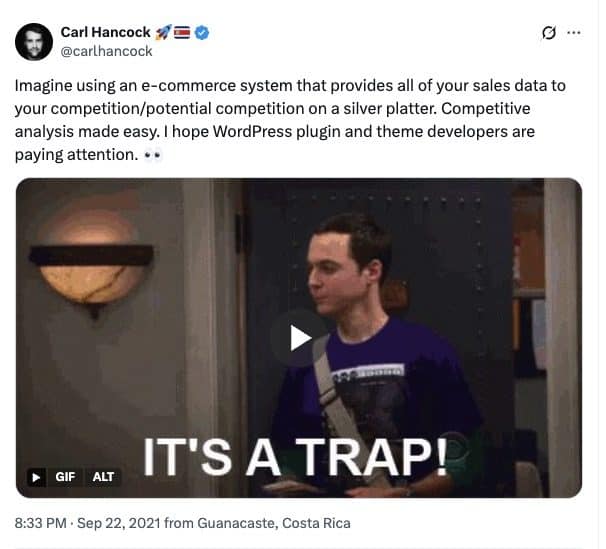 This was one of the contentions I first came across back when Easy Digital Downloads was acquired by Awesome Motive. I saw rumblings about the potential privacy problems of a lot of WordPress plugin developers who used EDD to sell their software suddenly concerned that Awesome Motive had backdoor access to all of their sales data. And obviously, Awesome Motive is competitor to most of these businesses so that would be of utmost concern. Here’s what Carl Hancock (founder of Gravity Forms) said at the time: